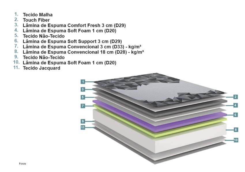 MODELO FORZA – O colchão Forza foi desenvolvido em 100% espumas maciças, de alta qualidade, toque superior no pillow no tecido em malha de um lado para maior conforto e do outro lado um jacquard super resistente, com espumas diferenciadas para gerar firmeza, mas com a suave sensação de toque de conforto, toque progressivo, pois contém densidades de espumas D33 e D28. Além das espumas puras, na sua estrutura foi adicionada a espuma exclusiva e patenteada, a Ecofresh, que tem como objetivo a sua resistência com um suave toque para o conforto, sem perder a qualidade e durabilidade. Espuma Fresh, especial, única, exclusiva, projetada com a mais alta tecnologia de mercado, que exerce uma excelente relação entre maciez e suporte, maior capacidade de passagem de ar em relação as espumas convencionais, maior sensação de frescor, contribuindo para uma vida mais saudável de quem a utiliza. Colchão Double Face, opção de utilizar dos dois lados, com a vantagem de optar pelo nível de conforto, um lado mais firme e outro mais confortável. Este lançamento foi desenvolvido com muito carinho pensando em clientes que não se adaptam em colchões de molejo, não importa o tipo de mola nem o seu tipo de conforto. Um colchão de 30 cm de altura de pura qualidade, pura espuma e muita beleza e durabilidade. Sem perder o visual de um colchão nobre, único, double face.