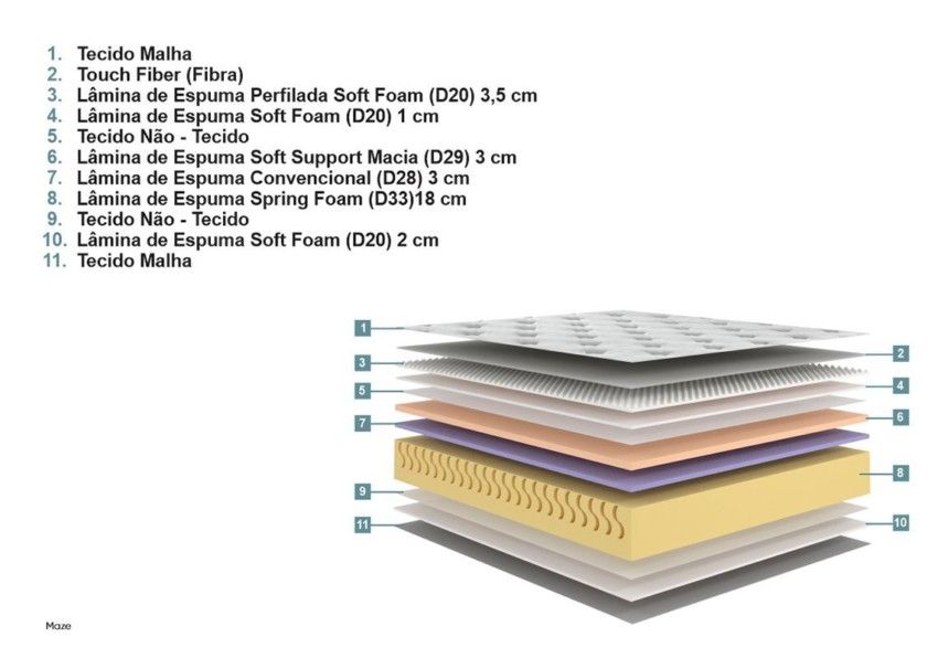 MODELO MAZE – Usando a tecnologia de cortes especiais, geométricos e tridimensionais, trazemos para este modelo o que há de mais inovador, sem perder as características dos colchões de espuma. Unindo a sensação de flexibilidade de molas, mas com a firmeza de quem adora usar um colchão tradicional. Um colchão com 31 cm de altura, com espumas internas especiais com cortes diferenciados no que há de mais moderno no segmento de colchões de espuma. Sendo o colchão com duas características: Firme ou Confortável. Podendo o consumidor escolher o lado de sua preferência para se adaptar melhor às suas noites de sono. Para esta alternativa de conforto diferenciado, um lado do colchão o pillow contém em sua estrutura a espuma perfilada que suavemente fornece um efeito massageador para melhor relaxamento e do outro lado do colchão o pillow contém a espuma soft foam. Mais qualidade, opção de conforto e principalmente para agradar aos consumidores que preferem colchões de espuma e não de molas. Garantindo assim ótimas noites de descanso.