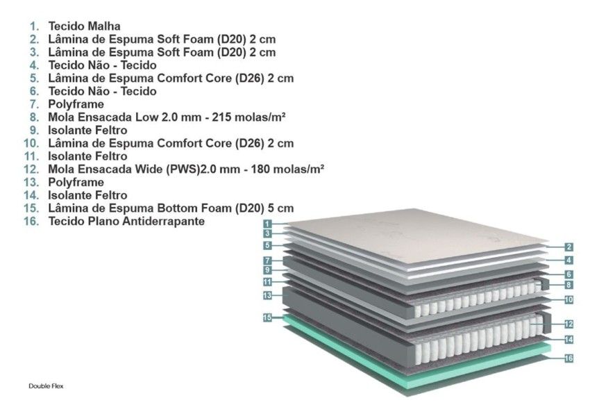 MODELO DOUBLE FLEX – A inovação sempre fez parte da Ecoflex. Sempre pensando em levar o melhor produto e as melhores tendências de mercado, novamente surpreendemos nossos clientes com um produto diferenciado, duplo molejo. Um colchão desenvolvido para visual e conforto. Toda qualidade acompanha a composição de um colchão com 38 cm de altura, com dois sistemas de molas ensacadas integradas, a Wide e a Low. A mola ensacada Wide na estrutura para resistência e a Low para deixar o pillow do colchão com um toque especial de conforto, acompanhado de materiais de qualidade para acomodar a estrutura corporal de quem a utiliza sem perder o alinhamento corporal. Tecido do tampo em malha para aconchego e beleza. No sistema No Flip, que não precisa virar o colchão, apenas girar e o tecido do lado inferior é antiderrapante. Colchão confortável e adequado para biótipos de até 120 kg individual.